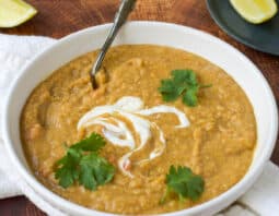 This delicious Red Lentil Soup is primarily made of pantry basics and can be made vegetarian or vegan!
