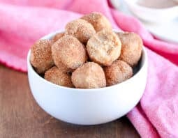 - On a plate, mix together remaining cinnamon and 2 teaspoons of sugar. Roll dough bites in the mixture.